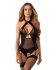 Krój z otwartym przodem oraz paskami akcentującymi talię i biodra doskonale modeluje sylwetkę, eksponując jej najpiękniejsze kształty. Całość uzupełnia regulowany choker, który dodaje wyrafinowanego charakteru, oraz paski do pończoch, dzięki którym stylizacja staje się jeszcze bardziej seksowna.